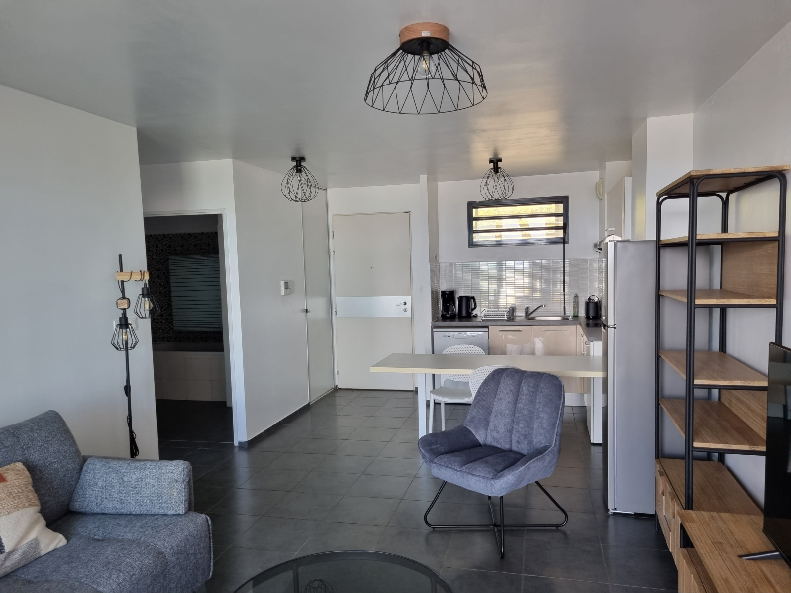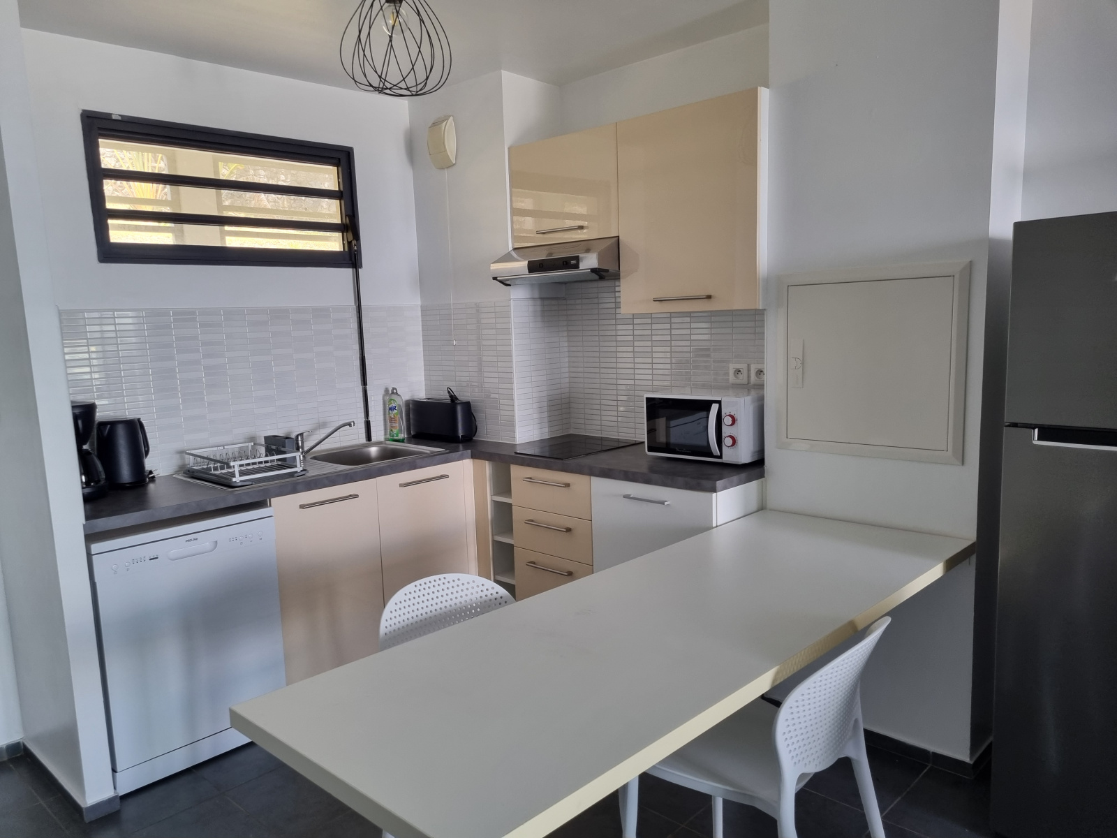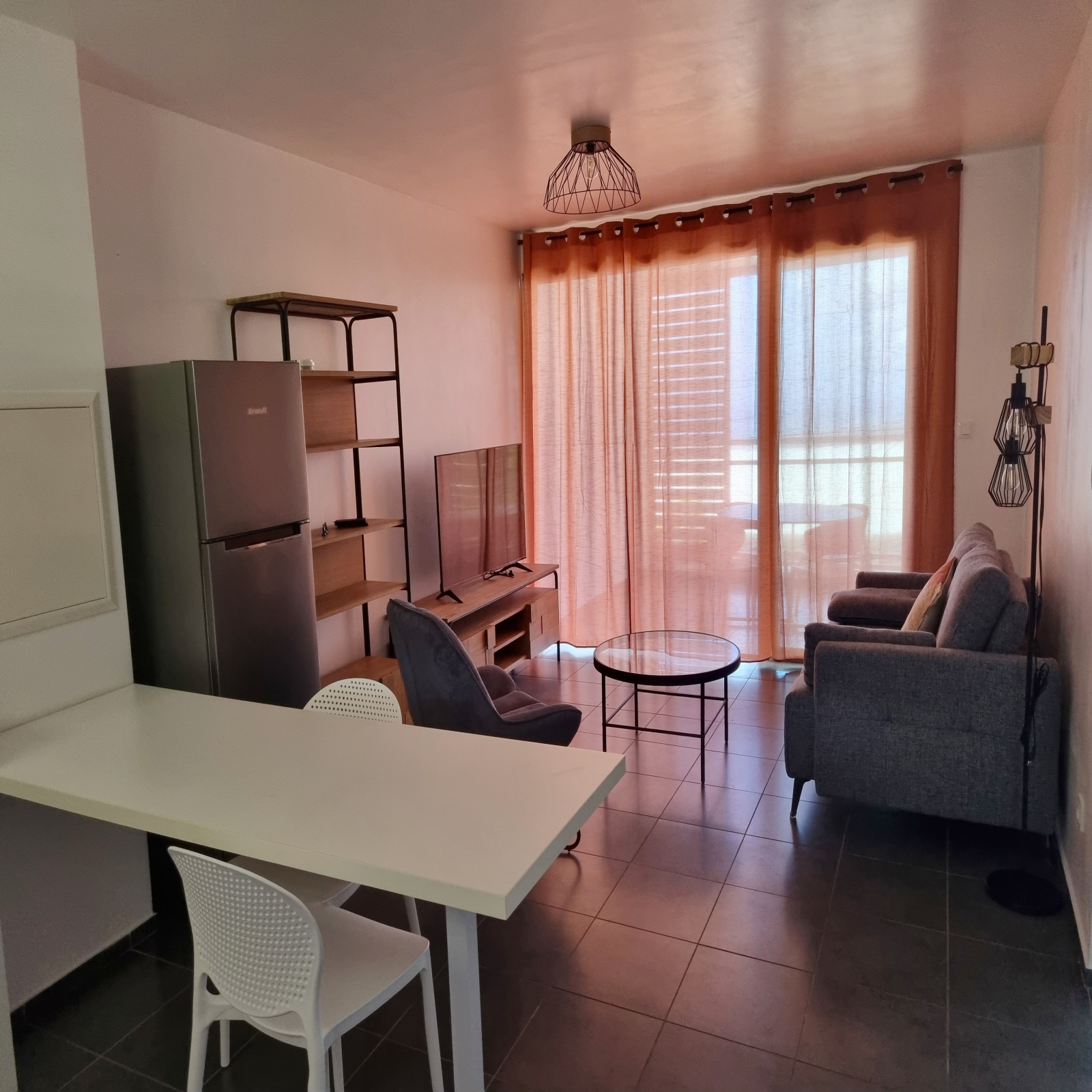 Beau T2 meublé trés lumineux avec des équipements neuf de trés bonne qualité, situé sur Saint-Denis dans une résidence sécurisée, d'une surface hab de 42.90 m² + une varangue de 10.10 m². Équipé et composé de : un séjour, une cuisine ouverte, une chambre, une salle de bains et un WC.