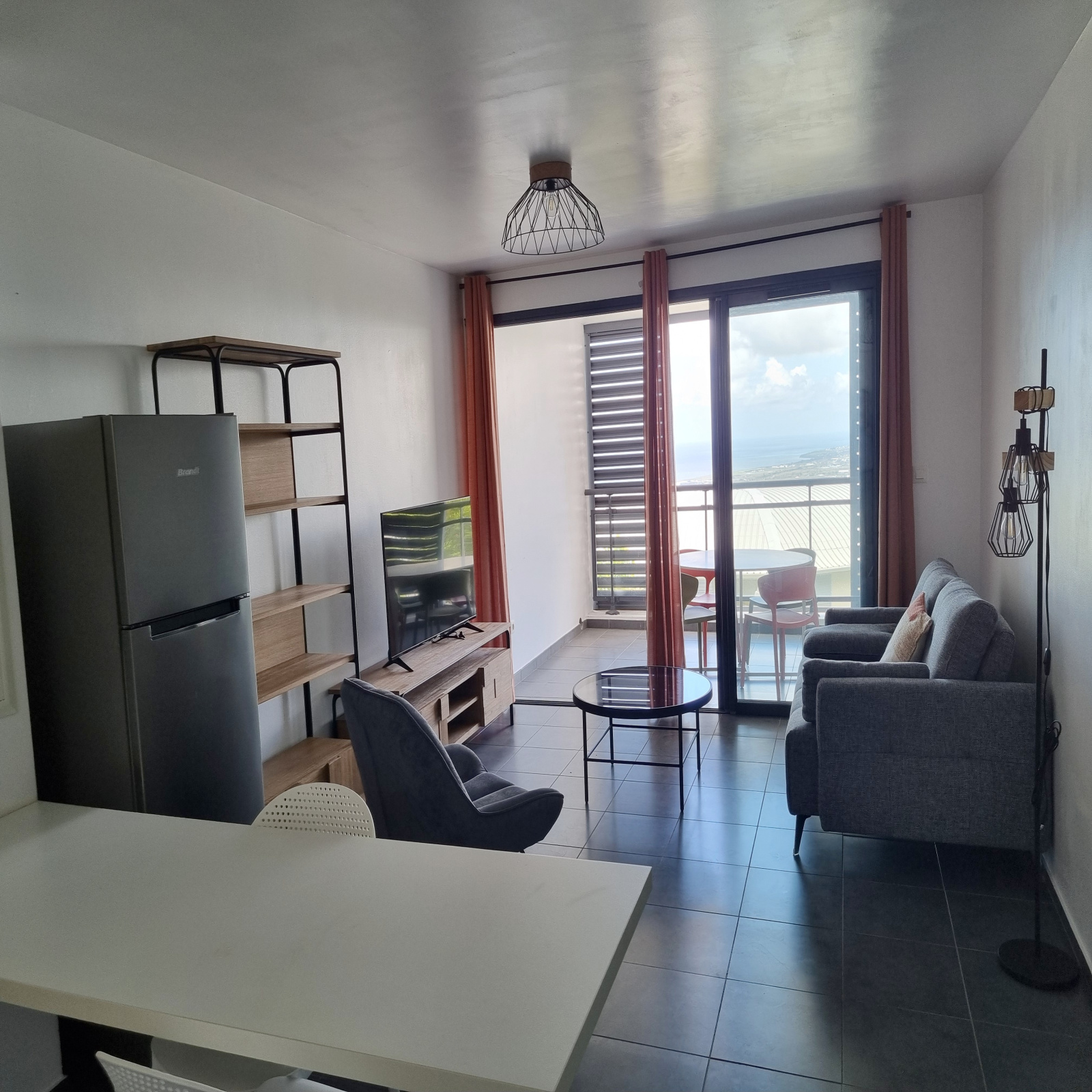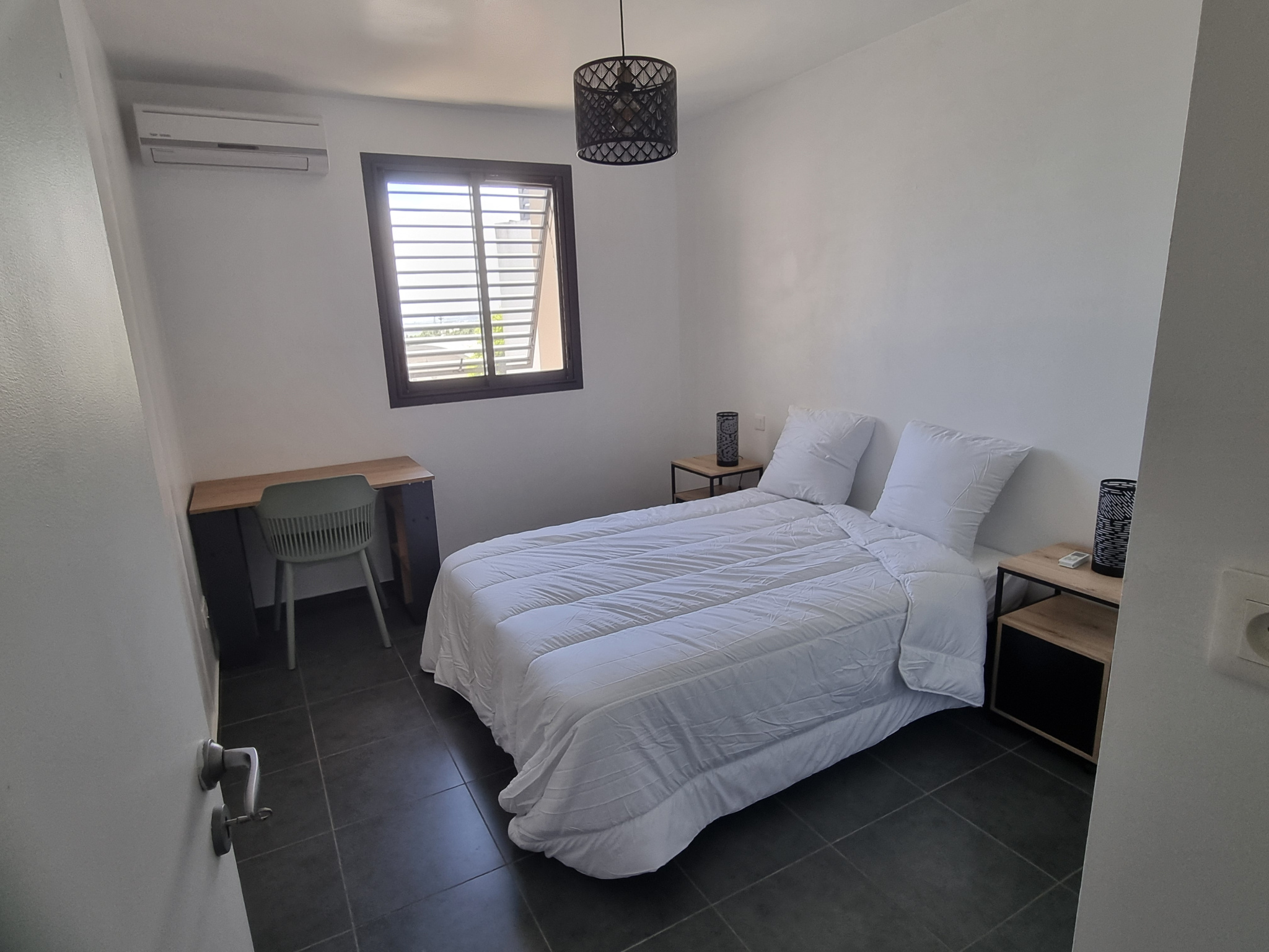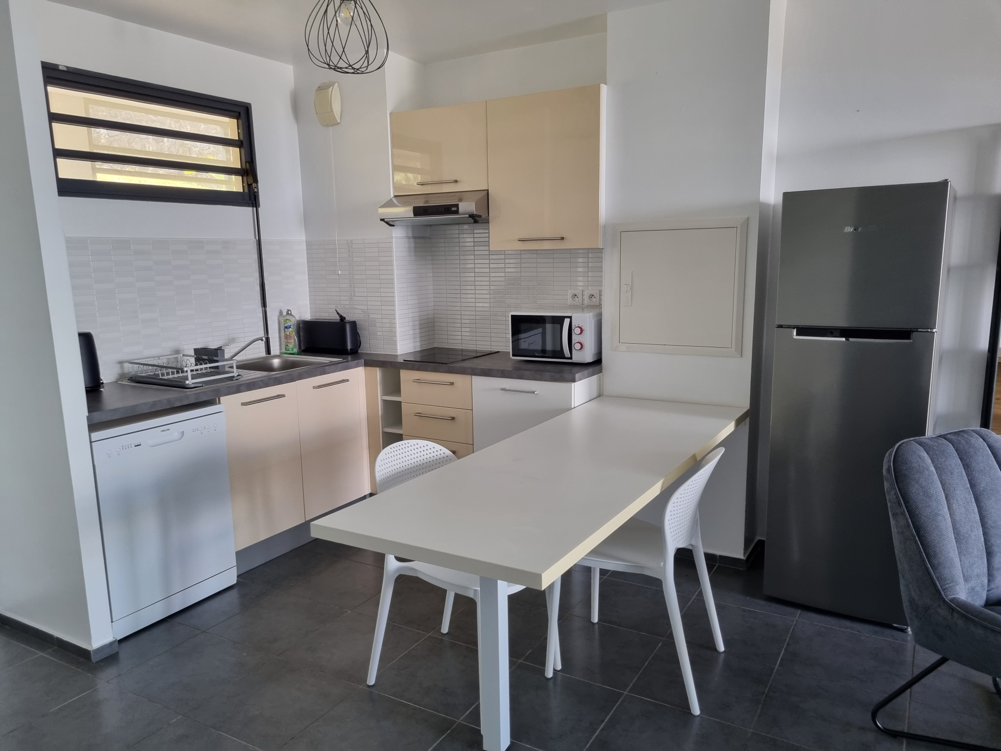 Beau T2 meublé trés lumineux avec des équipements neuf de trés bonne qualité, situé sur Saint-Denis dans une résidence sécurisée, d'une surface hab de 42.90 m² + une varangue de 10.10 m². Équipé et composé de : un séjour, une cuisine ouverte, une chambre, une salle de bains et un WC.